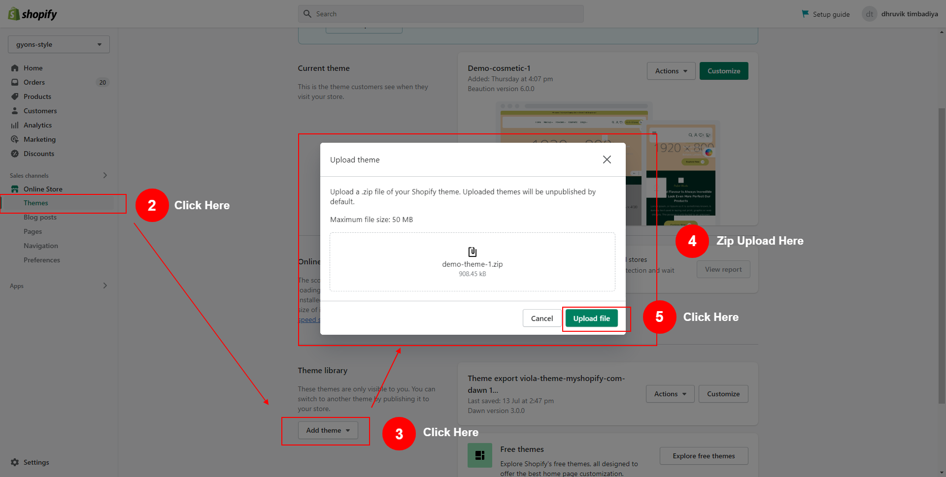 - Upload Zip Your Shopify Store:- Themes > Add Theme > Upload demo-theme-1.zip Upload File