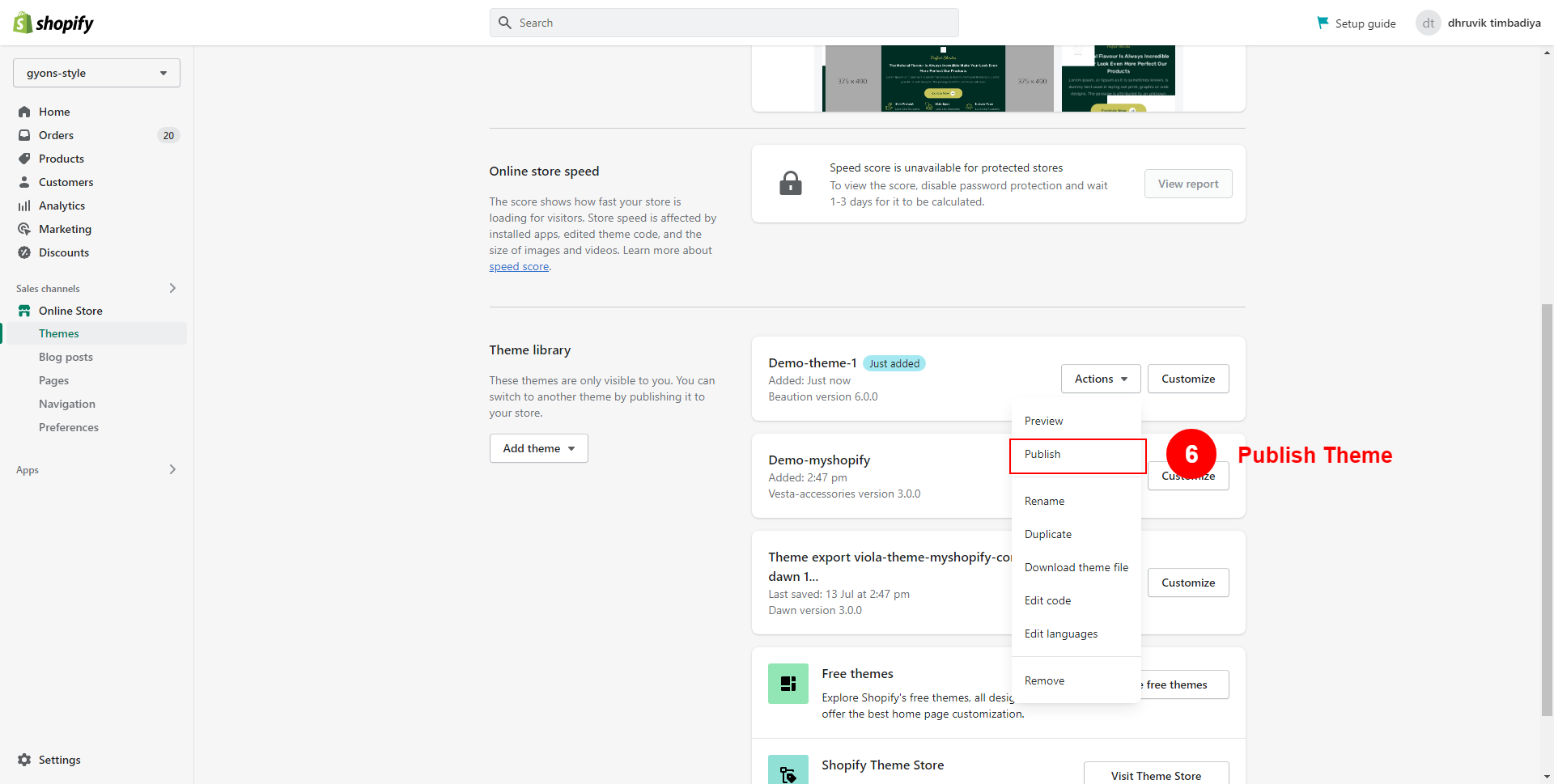 To install the theme, please log in to your Shopify store and go to the Themes. From there, follow the instruction below: